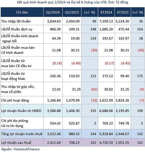 Nhìn chung, kết quả kinh doanh của LPB trong quý 2/2024 cho thấy ngân hàng đang nỗ lực mở rộng hoạt động, tăng cường huy động nguồn vốn và đẩy mạnh cấp tín dụng, cho thấy LPB nỗ lực phát triển với chiến lược kinh doanh mới, mang lại giá trị mới cho khách hàng, đối tác và cổ đông.