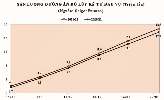 Nguyên nhân giảm của giá đường do thị trường kỳ vọng vào sản lượng tăng ở Ấn Độ. Theo nguồn tin từ ISMA (Hiệp hội Nhà máy đường Ấn Độ), sản lượng đường lũy kế từ đầu mùa vụ 2021-2022 (tháng 10-2021 đến hết tháng 1-2022) đạt 18,71 triệu tấn, tăng khoảng 1 triệu tấn so với mức 17,71 triệu tấn của cùng kỳ mùa vụ 2020-2021, tương ứng tăng 5,7%.