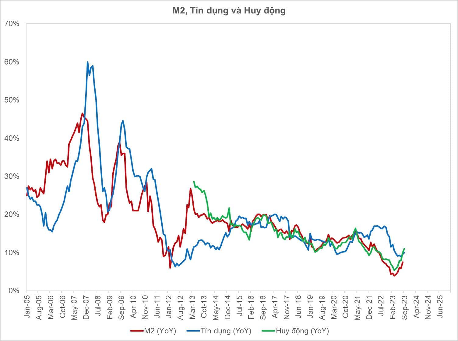 Nhìn biểu đồ này có thể thấy VN điều hành chính sách cung tiền - tín dụng ổn định và tốt hơn trước đây rất nhiều (trừ thời điểm cuối năm 2022), điều này góp phần giúp cho chúng ta ổn định kinh tế rất tốt với lạm phát chỉ khoảng 2-5% trong 10 năm qua.