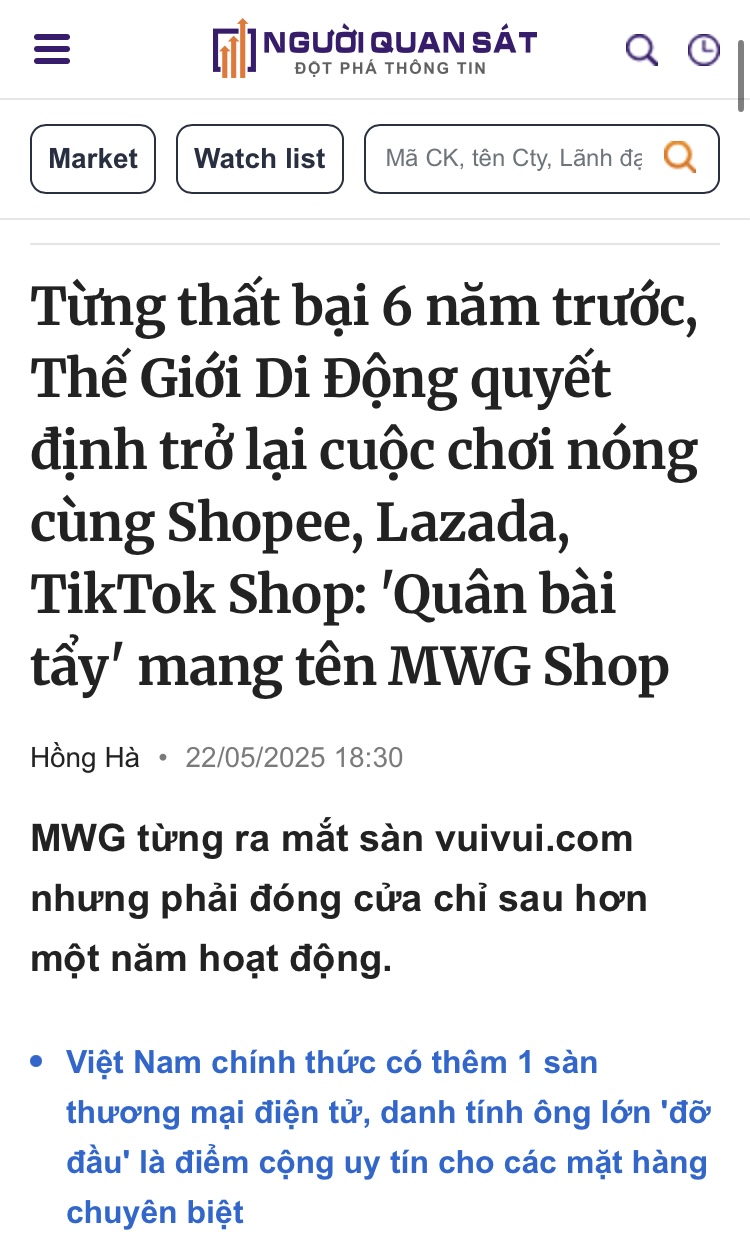 Vam cược MWG vào mảng thương mại điện tử. Canh lâu rồi, chờ mấy nay tiền vào mạnh và tin ra chính thức thì Vam cũng vào.