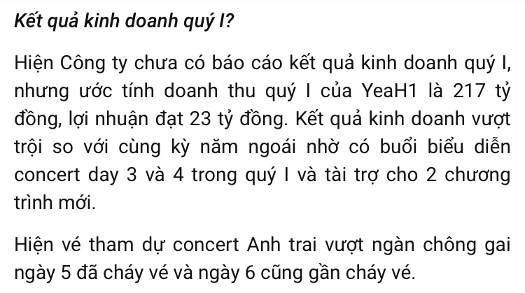 Yeg nhìn chart ngắn và trung hạn đều ổn, rsi w và 3d ẩn pk tăng giá. Về FA thì khả năng ra bctc q1 tốt, tôi tạm ước doanh thu riêng concert Anh trai đã thực hiện trong quý 1 vào khoảng 225 tỷ, = 17% kh dt cả năm. Ko thủng giá 10 là vẫn giữ trend tăng trung hạn.