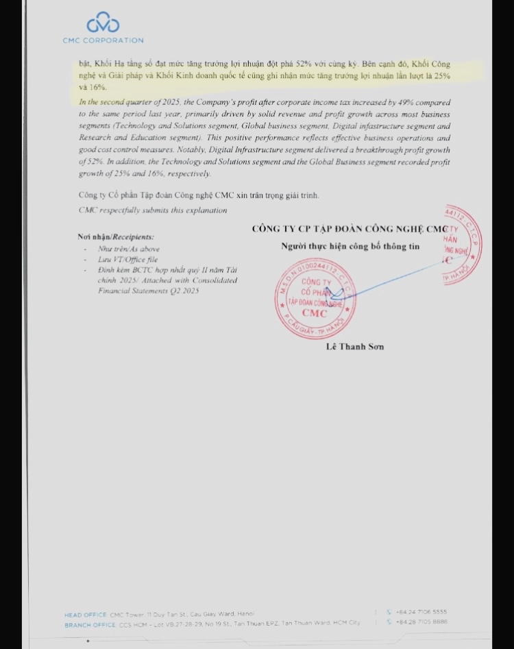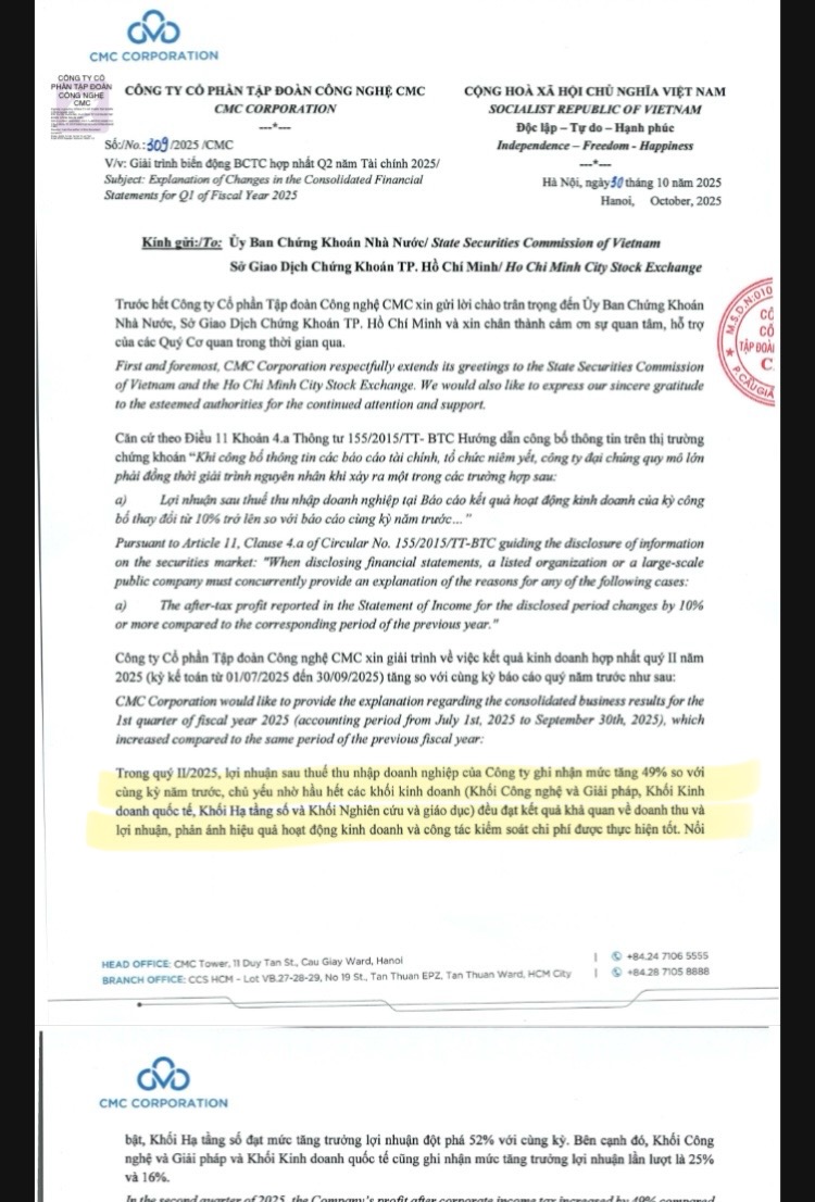 CMG hôm nay vừa ra bctc và giải trình biến động lãi nè Tammy. 49% tăng so cùng kỳ. với 1 DN tech mà tăng trưởng trên 25% đều đặn như FPT mỗi năm là ngon rồi. 49% là quá tốt ở mảng core khối công nghệ
