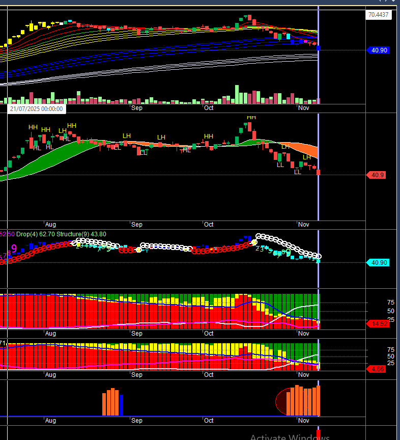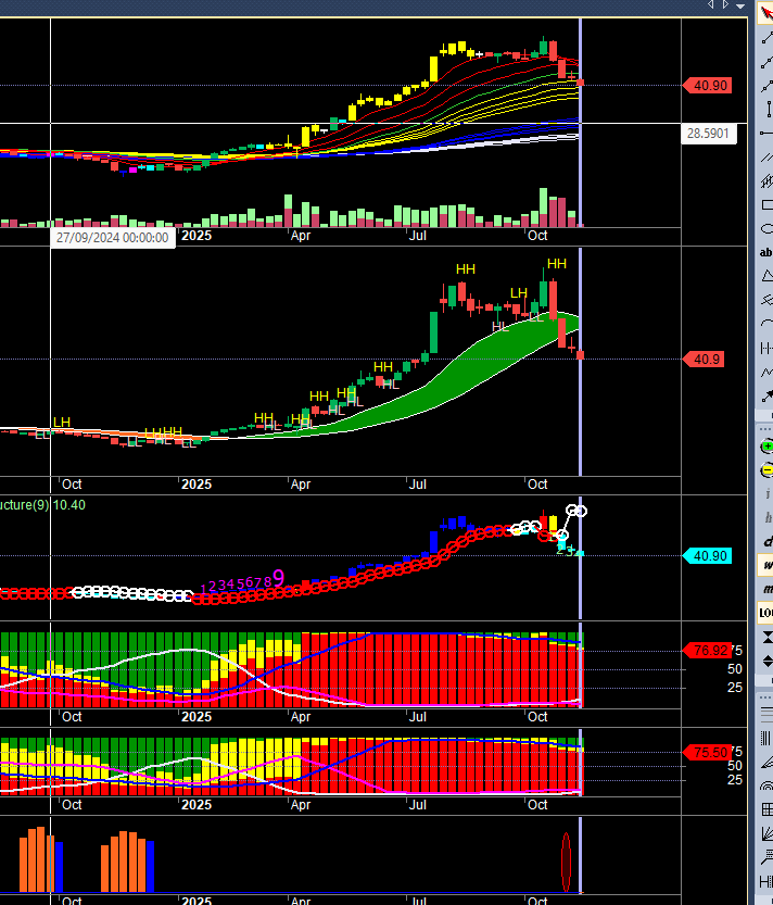 Cái dải màu xanh đó thể hiện trạng thái tăng nếu vi phạm chuyển sang màu cam thì thị trường trung hạn sẽ chính thức gãy và chuyển sang xu hướng giảm
