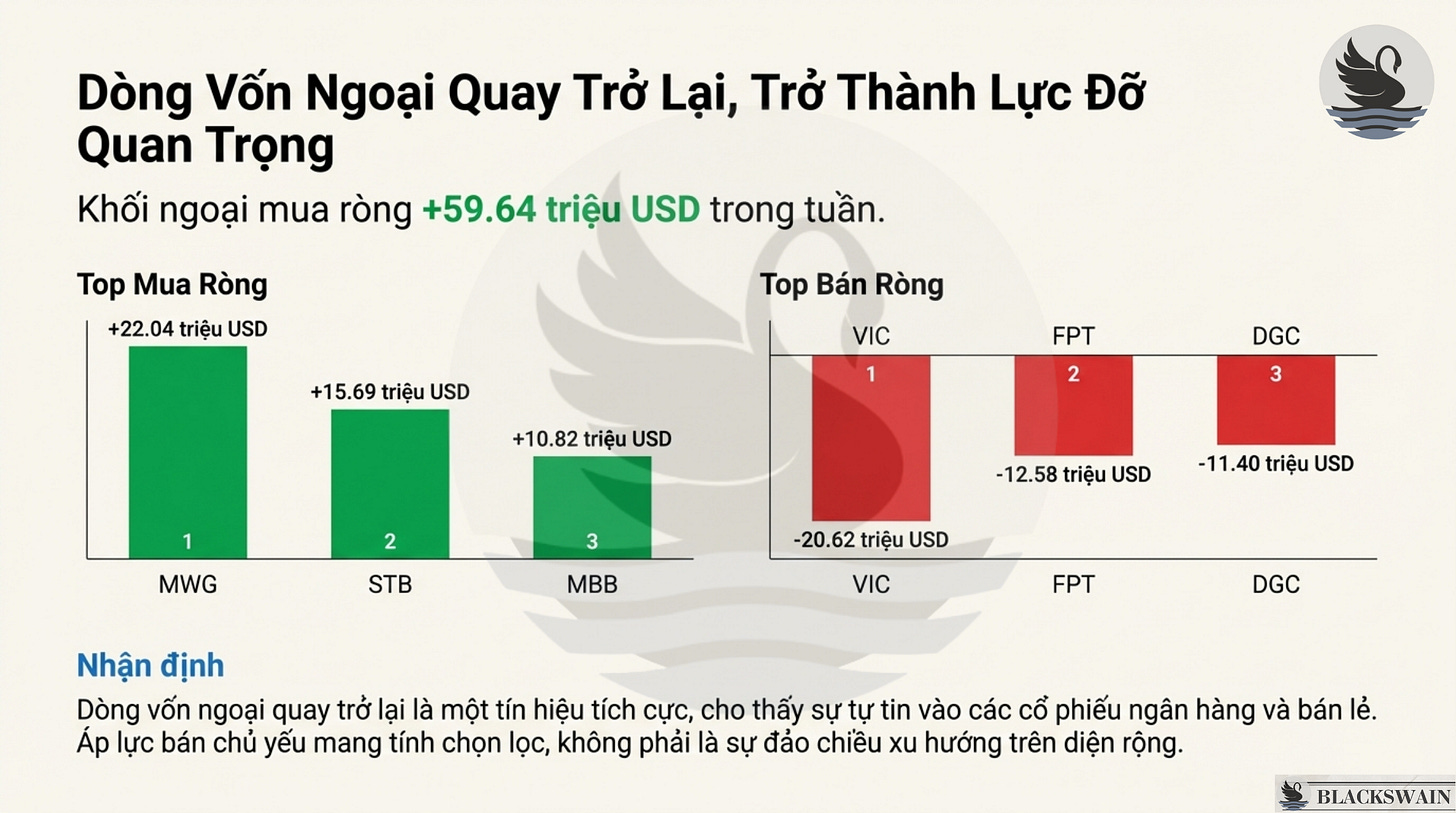 - Khối ngoại trở lại mua ròng: Sau giai đoạn bán ròng kéo dài, nhà đầu tư nước ngoài đã quay lại mua ròng mạnh mẽ với giá trị 59,64 triệu USD . Các mã được ưu tiên tích lũy bao gồm MWG (22,04 triệu USD) , STB (15,69 triệu USD) và MBB (10,82 triệu USD) . Ngược lại, áp lực bán tập trung vào VIC (20,62 triệu USD) do tin tức thoái lui dự án hạ tầng.