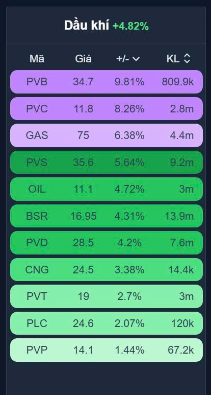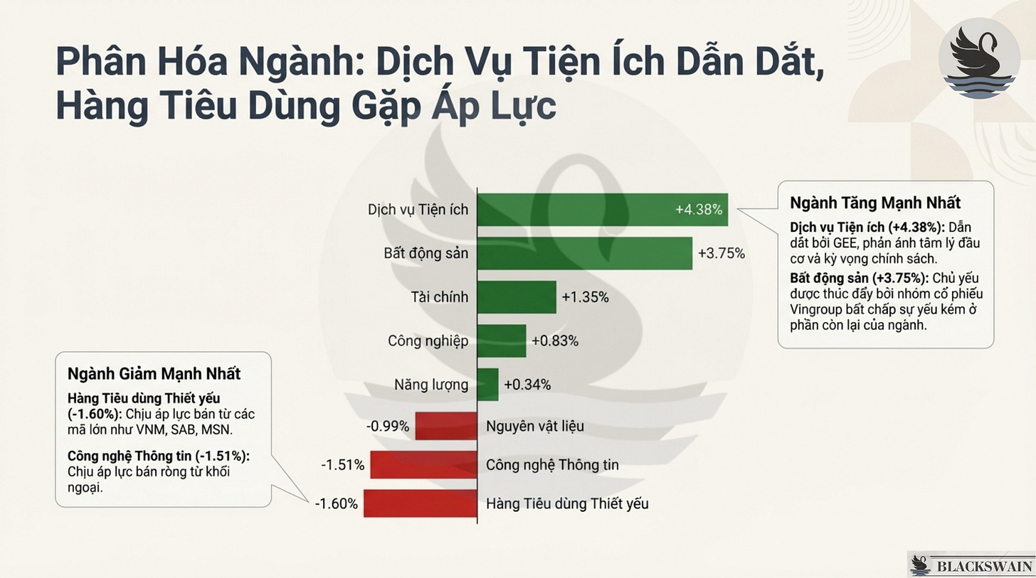 Tiện ích (Utilities) dẫn đầu (+4,38%): Được thúc đẩy mạnh mẽ bởi mã GEE nhờ tâm lý đầu cơ quay trở lại và kỳ vọng vào các chính sách dài hạn.