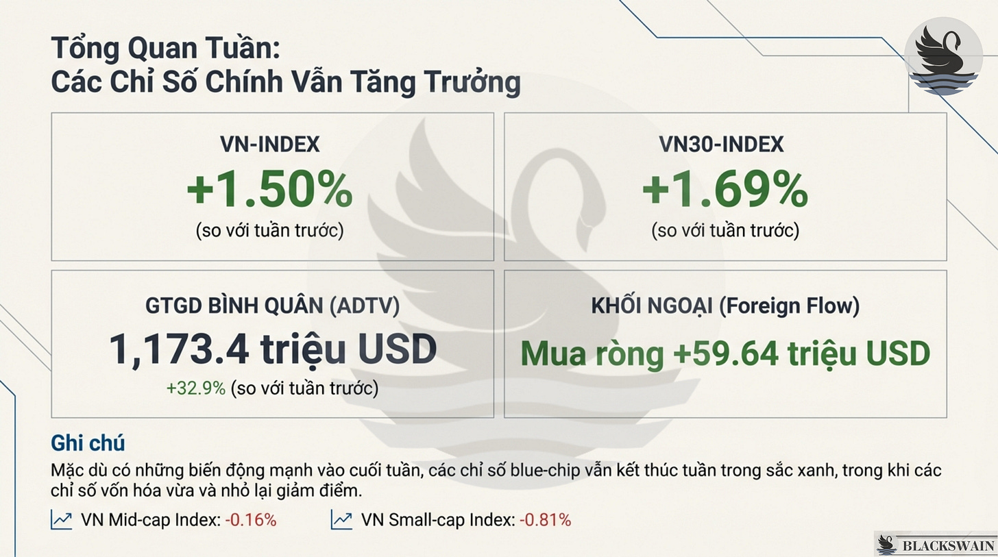 Thanh khoản bùng nổ: Giá trị giao dịch trung bình hàng ngày (ADTV) tăng vọt 32,9% so với tuần trước, đạt 1.173,4 triệu USD , cao hơn 19,2% so với trung bình một tháng. Thanh khoản cải thiện cho thấy dòng tiền bắt đáy hoạt động rất tích cực khi giá cổ phiếu trở nên hấp dẫn sau các nhịp điều chỉnh.