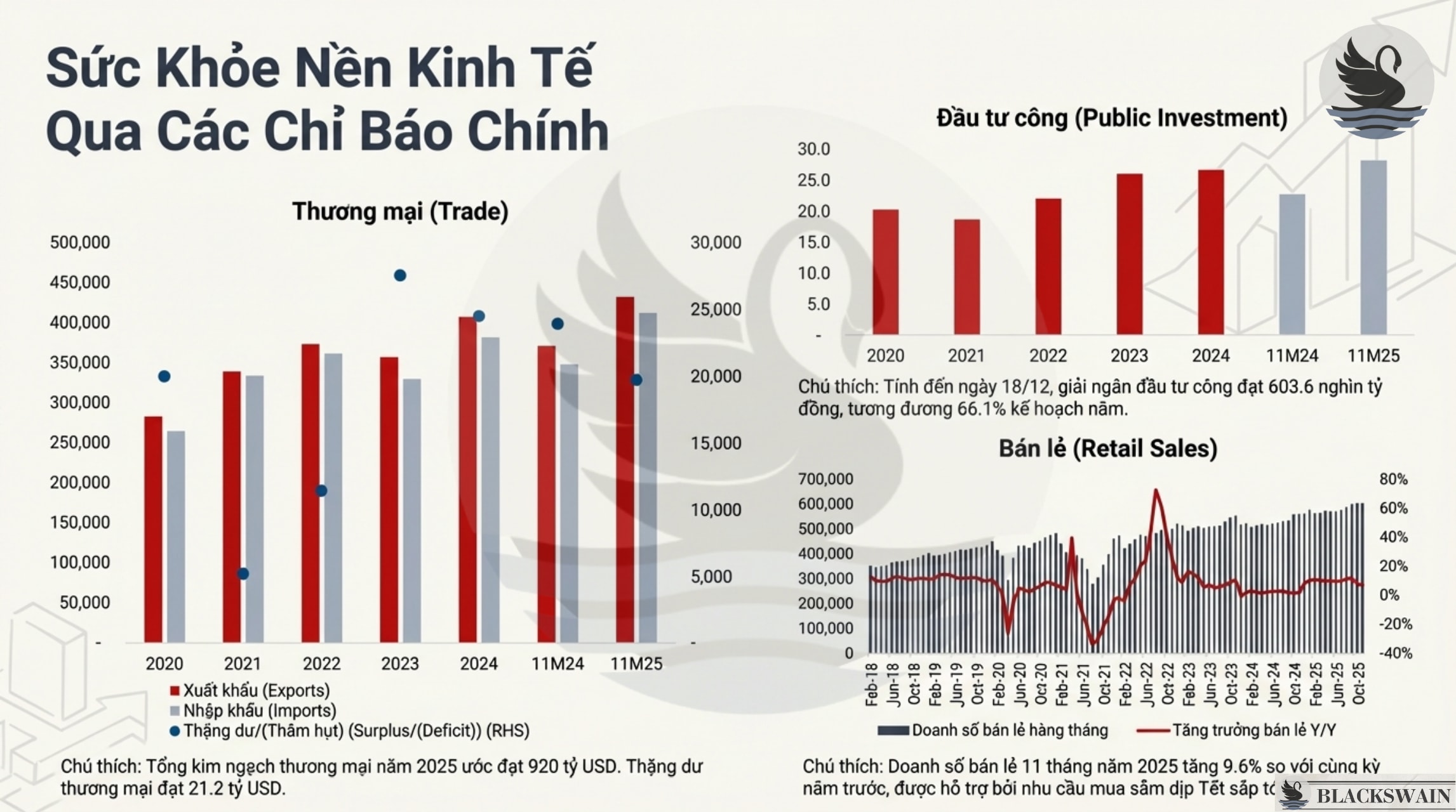 Tổng kim ngạch thương mại năm 2025 ước đạt 920 tỷ USD (+16,9% YoY) , thặng dư thương mại đạt 21,2 tỷ USD . Khu vực FDI tiếp tục đóng vai trò chủ đạo, chiếm 72% tổng kim ngạch. Đặc biệt, xuất khẩu sang Mỹ đạt kỷ lục 138,6 tỷ USD , nhờ nhu cầu mạnh mẽ về máy chủ AI và thiết bị bán dẫn.