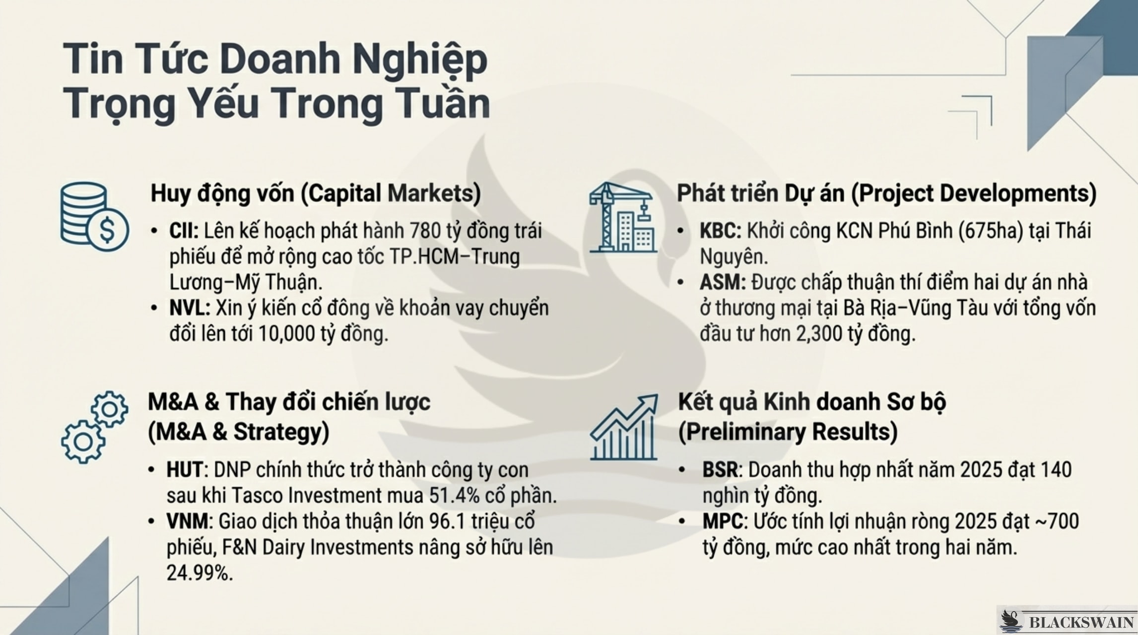 GAS (+10,16%): Kết quả kinh doanh sơ bộ 2025 khả quan với doanh thu ước đạt 134 nghìn tỷ đồng (+27% YoY) và lợi nhuận trước thuế đạt 14,5 nghìn tỷ đồng (+10% YoY),. Động lực tăng trưởng chính là doanh số kỷ lục của mảng LPG/LNG (+64% YoY).
