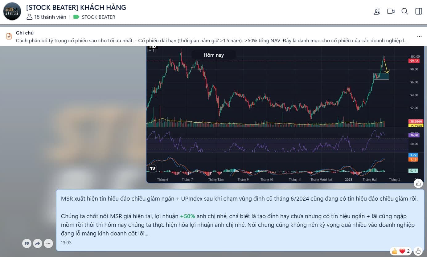 Hôm nay xin phép anh em bỏ trước 1 chân (50% tỷ trọng) khỏi thuyền MSR nhé, vẫn giữ lại 1 chân quan sát thêm vì soi kỹ thuật thì có vẻ MSR vẫn chưa tạo đỉnh đâu…