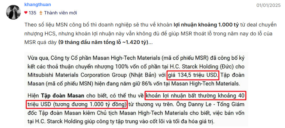 Thế này thì MSR chắc chắn báo lãi khá cao vì lãi Quý 4 của Masan phần lớn nhờ MSR. Masan vừa ra báo cáo tài chính lãi gần 700 tỷ mặc dù bị ảnh hưởng lợi nhuận từ TCB mà nó vẫn lãi cỡ đó