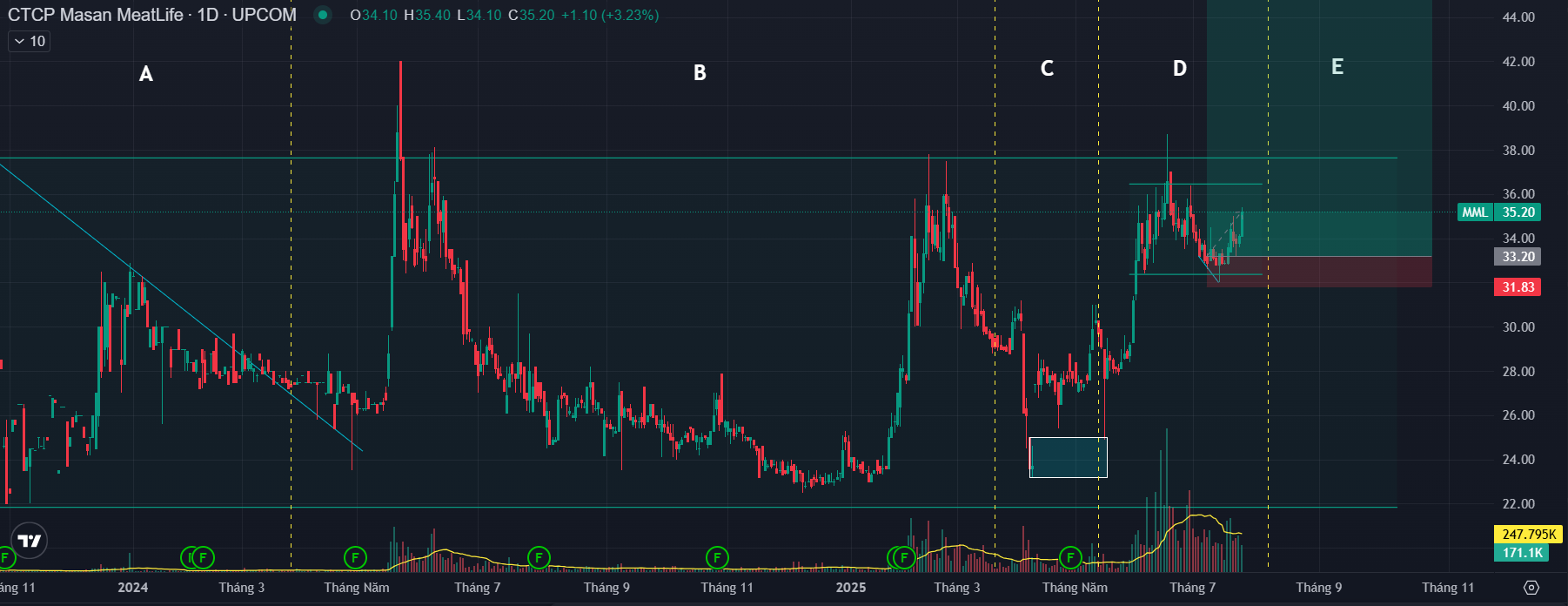 Quan sát cấu trúc giá không thấy tín hiệu đảo chiều xu hướng giảm của cổ phiếu nữa, có thể cho rằng đây là vùng tái tích lũy đỉnh để cổ phiếu chuẩn bị bước vào nhịp tăng nước rút cho mùa BCTC Q2/2025.