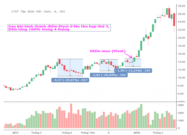 – Sau khi hình thành điểm Pivot, DXG đã tăng 100% chỉ trong vòng 4 tháng, từ mức khoảng 13.000 đồng/cổ phiếu lên hơn 26.000 đồng/cổ phiếu vào tháng 3 năm 2018.
