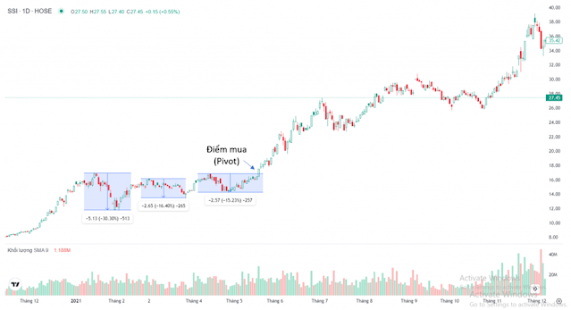 – Sau khi hình thành điểm Pivot, giá cổ phiếu SSI đã có một xu hướng tăng mạnh mẽ, từ mức dưới 16.000 đồng lên hơn 35.000 đồng trong các tháng tiếp theo.