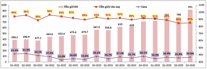 Trong bối cảnh cả ngành bank đều gặp áp lực về huy động đầu vào để phục vụ cho vay tăng trưởng mạnh thì với MBB cũng không phải ngoại lệ. Cụ thể tỉ lệ tiền gửi/cho vay của ngân hàng liên tục sụt giảm từ 2022 cho tới nay. Kết thúc Q4-2025 tỉ lệ tiền gửi/ cho vay chỉ đạt 85%, giảm 11% so với cuối 2022. (Hình 3)