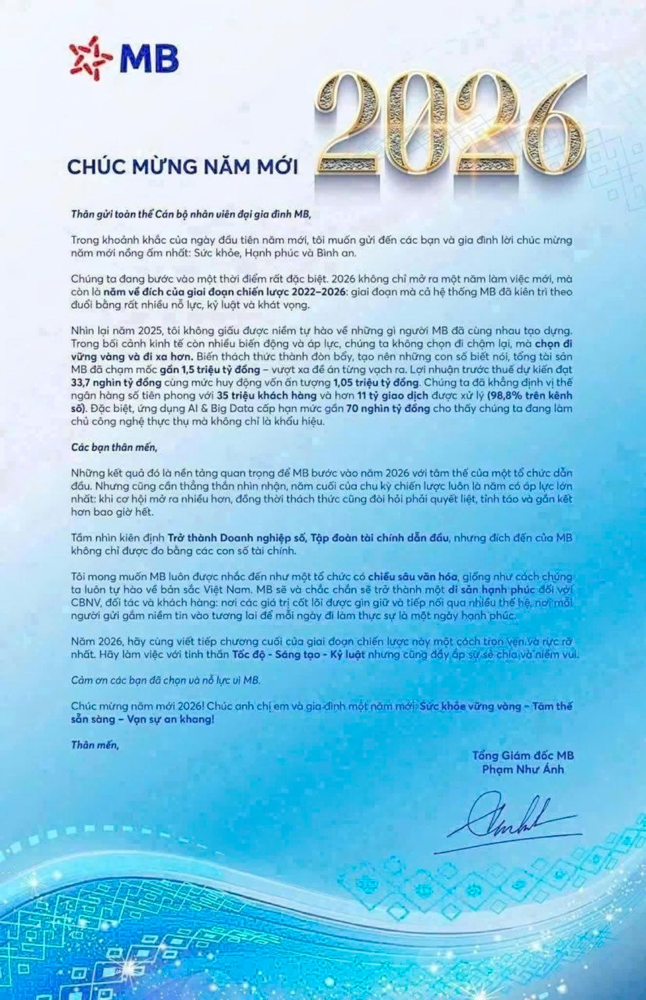 Với vị thế là một trong 5 ngân hàng hàng đầu Việt Nam, MB dự kiến tiếp tục khẳng định vai trò tiên phong trong chuyển đổi số, phát triển bền vững và đồng hành cùng sự nghiệp xây dựng, bảo vệ Tổ quốc.