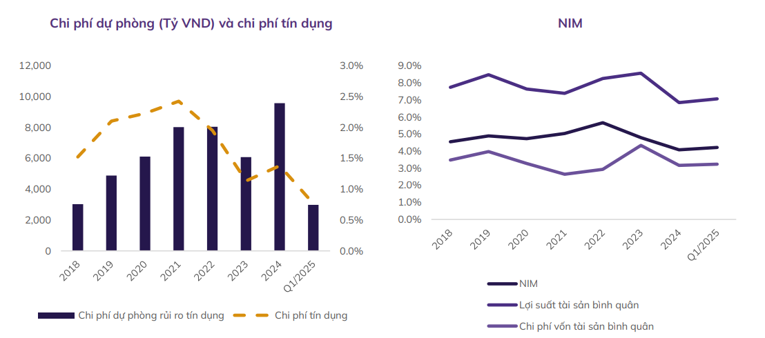 Áp lực suy giảm NIM tiếp tục duy trì trong nửa đầu năm 2025 do mặt bằng lãi suất cho vay ngành ngân hàng tiếp tục đi ngang để hỗ trợ nền kinh tế và lãi suất huy động dần tăng trở lại sau khi tạo đáy vào năm 2024 để đáp ứng nhu cầu tín dụng. Tuy nhiên, ngân hàng chuyển dịch trọng tâm sang bán lẻ và tỷ lệ CASA cao phần nào sẽ hạn chế sự sụt giảm của NIM. Dự báo NIM sẽ dần hồi phục vào cuối năm 2025 và đà phục hồi tiếp tục được duy trì sang năm 2026 khi bán lẻ và thị trường bất động sản được cải thiện giúp đẩy mạnh nhu cầu tín dụng, đồng thời, gói và chính sách hỗ trợ lãi suất sẽ thu hẹp khi nền kinh tế hồi phục, mang lại lợi suất cho vay cao hơn.