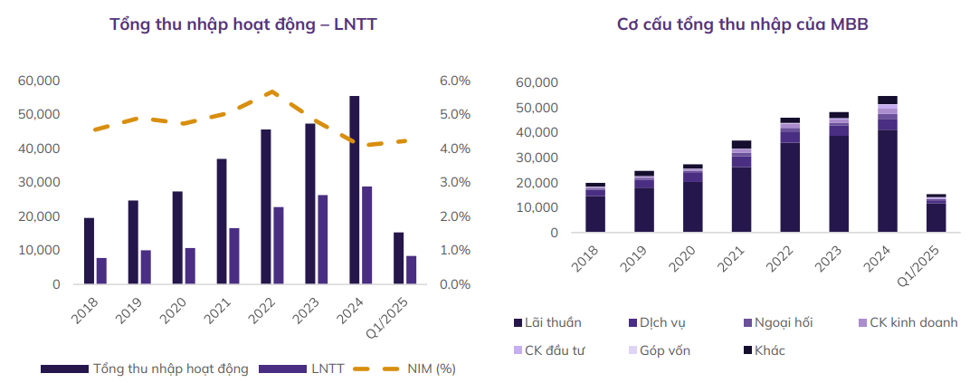 Kết quả kinh doanh Q1/2025 của MBB ghi nhận kỷ lục với LNTT đạt 8,386 tỷ đồng (+44,7% svck) nhờ thu nhập lãi thuần tăng mạnh mẽ (+29% svck) so với mức nền thấp của năm trước, trong khi thu nhập từ hoạt động dịch vụ có mức tăng ấn tượng +30,7% svck.
