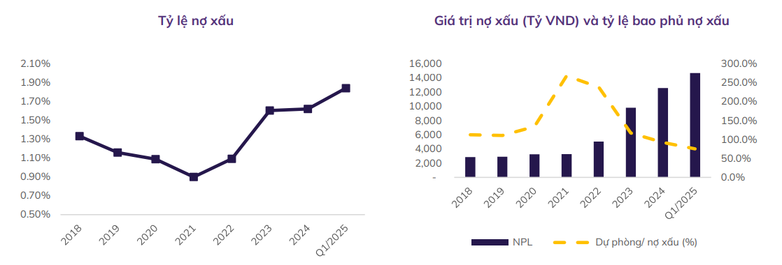 Tỷ lệ nợ xấu của ngân hàng tăng nhẹ lên mức 1,84% (tăng 22 điểm cơ bản so với quý trước nhưng giảm 64 điểm cơ bản svck). Tỷ lệ bao phủ nợ xấu cũng sụt giảm xuống mức 75,3% (giảm 17 điểm phần trăm sv quý trước và giảm 4,8 điểm phần trăm svck).