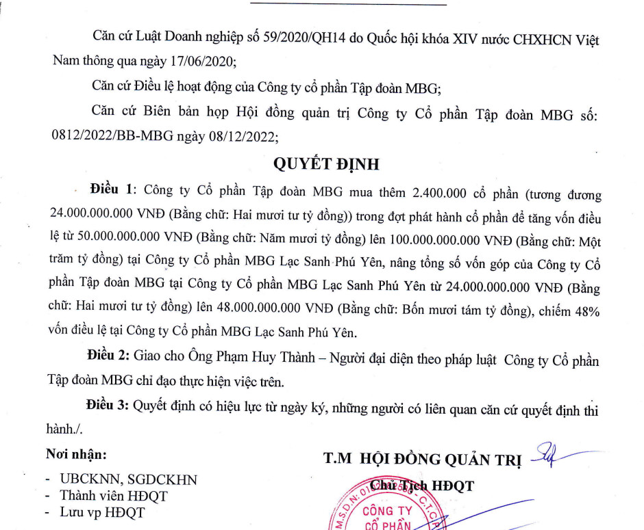 Tập đoàn MBG bản chất là công ty đa ngành , nhưng cái đa ngành này công ty tập chung ở một số mảng lợi thế. Vừa rồi MBG tăng sở hữu ở CTCP Lạc Sanh Phú Yên → đây là công ty cung cấp các dịch vụ du lịch, nghỉ dưỡng… tại du lịch ở Phú yên. → MBG đón đầu làn sóng du lịch quay trở lại từ việc Trung Quốc mở cửa. MBG dự kiến sẽ đem lại hiệu cao trong năm 2023.
