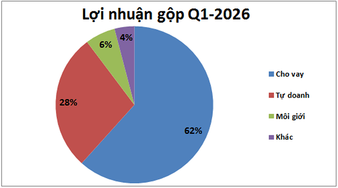- Đầu tiên là mảng FVTPL (một mảng thuộc tự doanh) trong Q1-2026 tuy ghi nhận doanh thu lớn hơn cùng kỳ nhưng do giá vốn cao nên lợi nhuận gộp lại sụt giảm so với cùng kỳ khi chỉ ghi nhận lợi nhuận gộp 45 tỷ đồng (cùng kỳ đạt 73 tỷ đồng). (Hình 2)