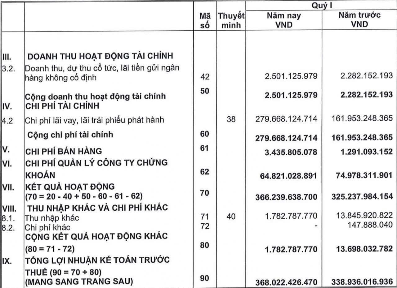 Tuy nhiên, mặt bằng chi phí gia tăng mạnh đã phần nào thu hẹp biên lợi nhuận. Chi phí hoạt động trong kỳ lên tới 307 tỷ đồng, gần gấp 3 lần cùng kỳ năm trước, trong khi chi phí tài chính đạt 280 tỷ đồng, tăng 73%. Dưới tác động của các yếu tố chi phí, lợi nhuận sau thuế quý I đạt gần 292 tỷ đồng, tăng 8% so với cùng kỳ, tương đương bình quân khoảng 3,2 tỷ đồng mỗi ngày. Đây là mức cao nhất trong các quý I từ trước đến nay, song vẫn thấp hơn mức đỉnh trên 300 tỷ đồng ghi nhận ở hai quý liền kề trước đó.