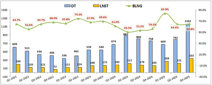 Hầu như tất cả các cổ phiếu nhóm ngành chứng khoán đều đón nhận KQKD Q3 ấn tượng khi cả thanh khoản và điểm số của thị trường tăng ấn tượng. Cụ thể Q3-2025 MBS ghi nhận doanh thu thuần đạt 1,162 tỷ đồng, cao nhất lịch sử công ty và tăng trưởng 44.2% yoy. Lợi nhuận sau thuế cũng ghi nhận 333 tỷ đồng, tăng 86% yoy và cũng là mức lợi nhuận theo quý cao nhất lịch sử công ty. (Hình 1)