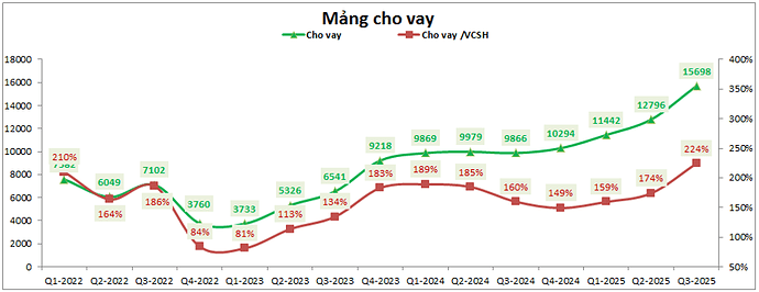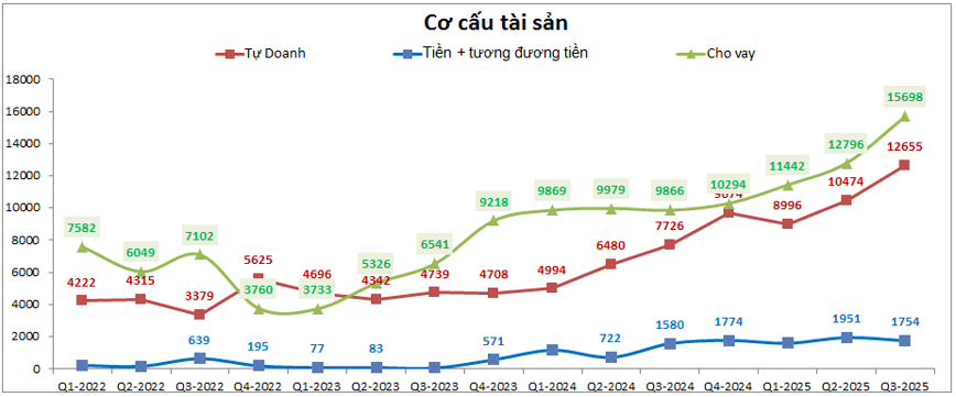 Tính đến cuối Q3-2025, tổng tài sản cho vay của MBS đã đạt 15,698 tỷ đồng, tăng tới 5,404 tỷ đồng so với đầu năm. Đáng chú ý tỉ lệ cho vay/VCSH của MBS đã lên tới 224%, vượt trần cho phép là 200%. Tuy nhiên MBS đã tiến hành tăng vốn vào cuối Q3 và đầu Q4 sẽ giúp cho vốn chủ của công ty tăng lên trong Q4 để đảm bảo không vi phạm quy định về vượt trần cho vay cho phép. Cụ thể MBS đã tăng vốn thêm 12% thông qua phát hành cho cổ đông hiện hữu với giá 10k. Ngoài ra thêm các hoạt động ESOP trong thời gian tới có thể giúp vốn chủ của MBS tăng thêm khoảng 700-800 tỷ đồng trong Q4-2025. Cộng thêm vơi lợi nhuận tiềm năng trong Q4 có thể giúp vốn chủ của MBS vào cuối Q4 có thể đạt khoảng 8,000 tỷ đồng, qua đó có thể cho vay khoảng 16,000 tỷ đồng. Trong Q4 có thể thanh khoản của thị trường sẽ chỉ dao động quanh 30-35k tỷ đồng mỗi phiên như phân tích ở trên do dòng tiền phần nào bị chảy sang kênh BDS nhưng theo chúng tôi tỉ lệ vay margin sẽ không giảm nhiều mà vẫn sẽ duy trì ở mức cao do thị trường chứng khoán về định giá và tiềm năng vẫn khá hấp dẫn nên khả năng cao MBS vẫn sẽ duy trì cho vay chạm trần cho phép, tức khoảng 16k tỷ đồng. Và điều này sẽ giúp lợi nhuận mảng cho vay của MBS trong Q4 có thể duy trì mức tương đương hoặc tăng nhẹ so với kết quả đã đạt được trong Q3 vừa qua.