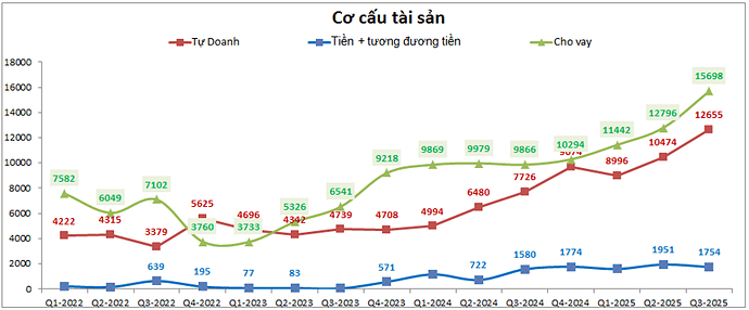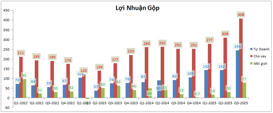 Danh mục tự doanh của MBS sẽ giúp công ty giảm thiểu tối đa rủi ro từ thị trường, tuy nhiên trong bối cảnh thị trường tích cực thì các công ty chứng khoán mà nắm giữ cổ phiếu tăng giá tốt sẽ bứt phá mạnh hơn so với các công ty cẩn trọng như MBS. Và với danh mục tự doanh an toàn chúng ta sẽ không khó để dự đoán KQKD của Q4-2025 tới. Với việc tài sản tự doanh vẫn tiếp tục tăng trong Q3-2025 sẽ là động lực giúp cho lợi nhuận mảng tự doanh của MBS tiếp tục tăng trong Q4-2025. Mức tăng có thể đạt khoảng 15-20% so với kết quả đã đạt được trong Q3-2025.