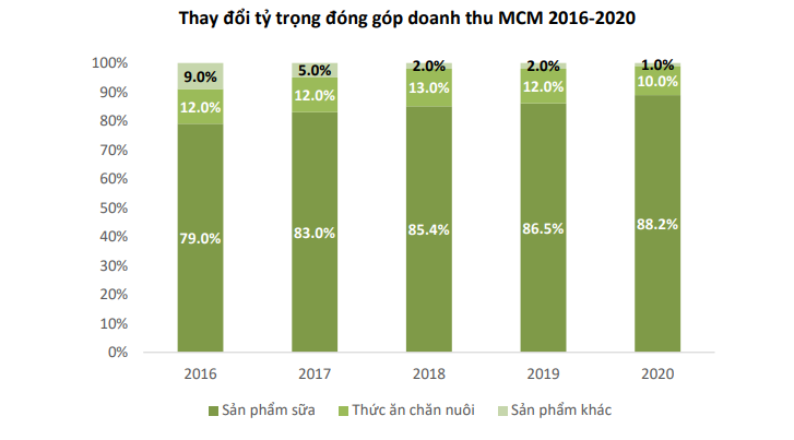Sản xuất, chế biến, và kinh doanh thức ăn chăn nuôi: MCM có trạm trộn thức ăn cho bò (TRM) của MCM có thể đáp ứng cho 35.000 con. Tỷ trọng: dưới 13% trên tổng doanh thu trong 2016-2020.