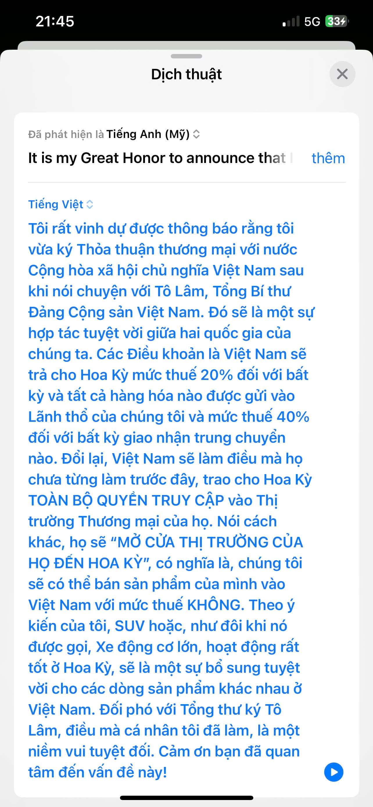 Sau cuộc điện đàm giữa Tổng Bí thư Tô Lâm và Tổng thống Donald Trump, hai bên đã đạt được thỏa thuận quan trọng về thuế nhập khẩu hàng Việt Nam vào Mỹ. Theo đó, mức thuế nhập khẩu sẽ giảm mạnh từ 46% xuống còn 20%, có hiệu lực từ ngày 9/7/2025. Đặc biệt, nếu doanh nghiệp chứng minh hàng hóa được sản xuất 100% tại Việt Nam, mức thuế ưu đãi chỉ còn 10% hoặc có thể được miễn thuế tùy từng mặt hàng.