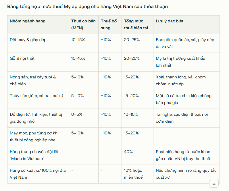 Thỏa thuận thuế Mỹ – Việt Nam ngày 2/7/2025 mở ra cơ hội lớn cho xuất khẩu hàng Việt với mức thuế nhập khẩu giảm mạnh. Đặc biệt, các doanh nghiệp có thể tận dụng ưu đãi thuế chỉ 10% khi chứng minh hàng hóa sản xuất hoàn toàn tại Việt Nam. Đây là thời điểm vàng để các ngành dệt may, gỗ, nông sản, thủy sản và điện tử đẩy mạnh xuất khẩu vào thị trường Mỹ.