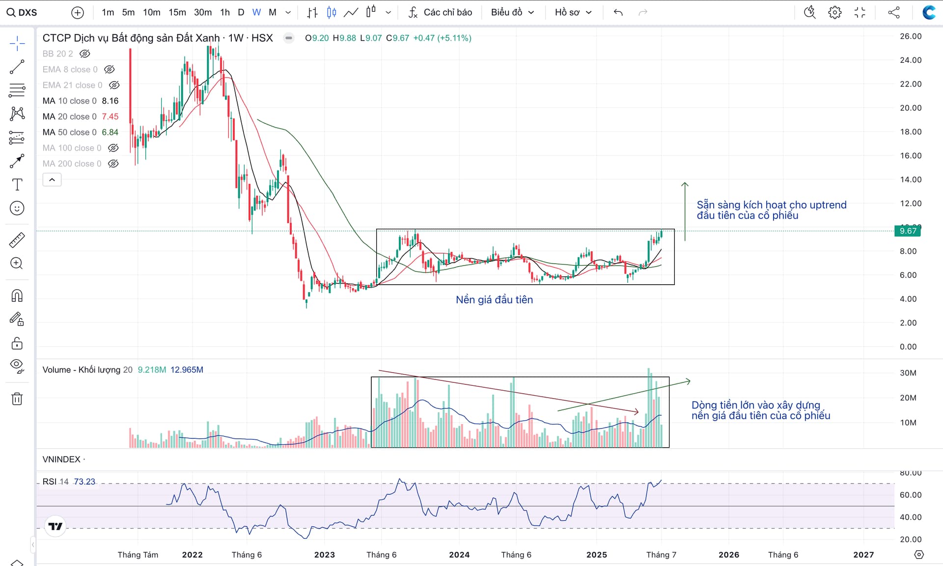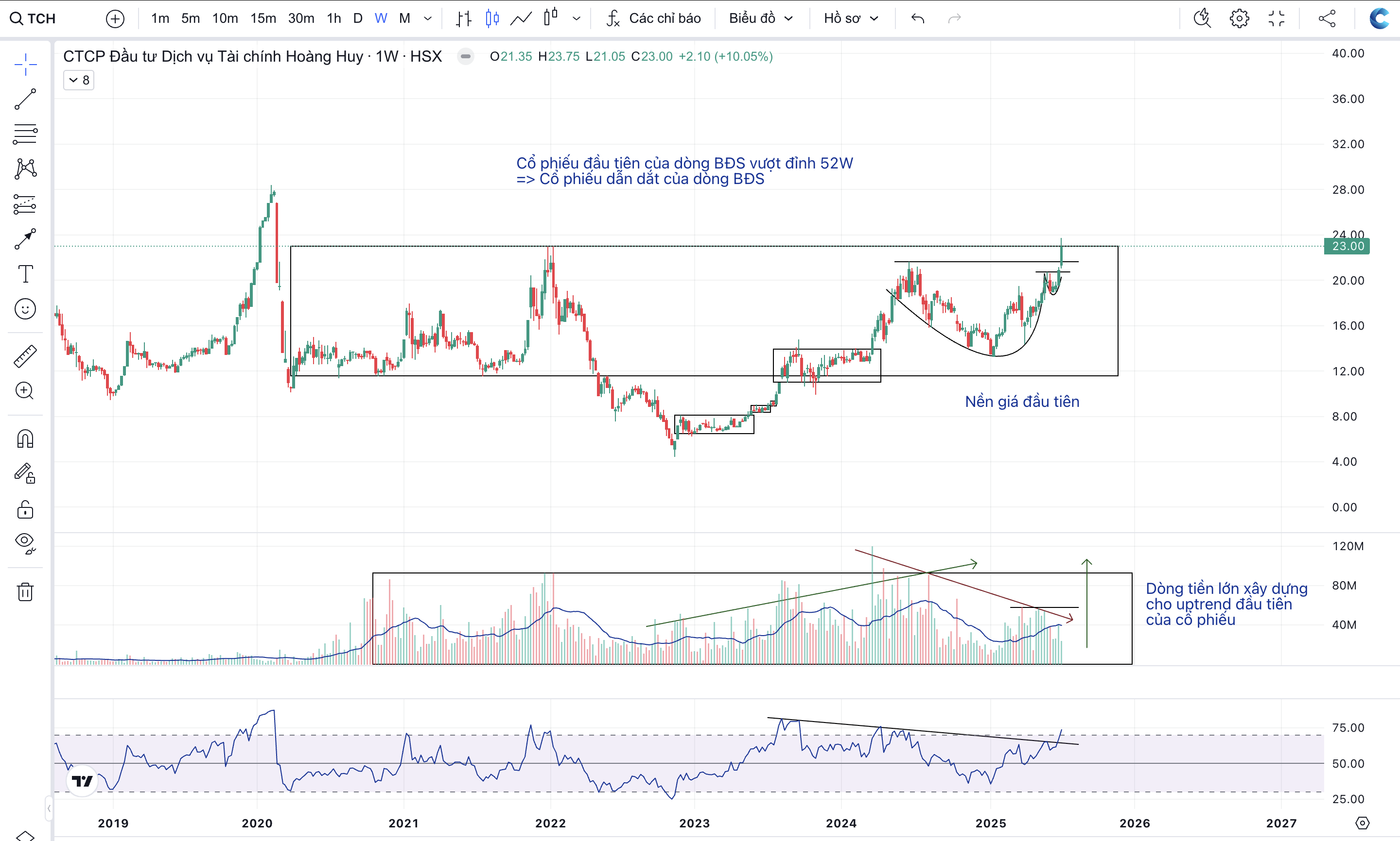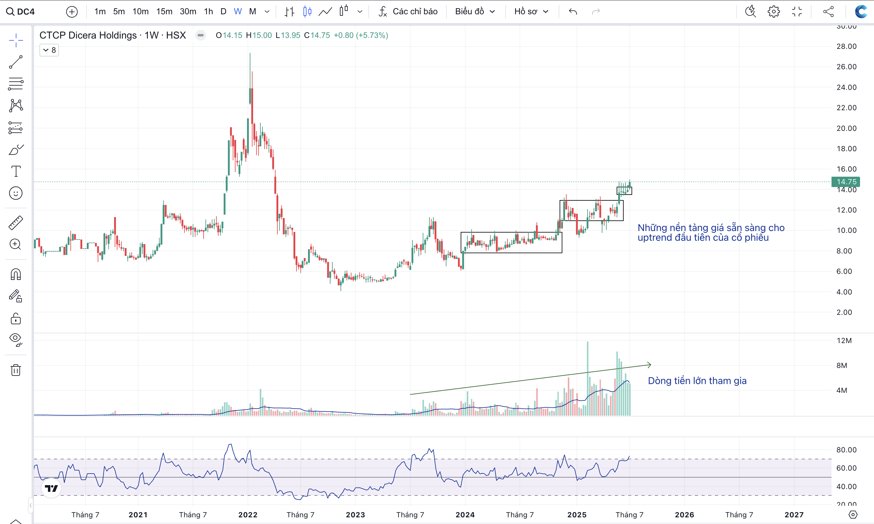 Năm 2025 này, đặc trưng của dòng tiền thông minh vẫn ko thay đổi khi đang định hình những siêu cổ phiếu phù hợp với “meta” mới cho thời điểm hiện tại. TCH - DXS - DC4 dường như đã xây dựng xong nền giá đầu tiên để sẵn sàng cho dòng tiền chảy vào nó bất kỳ lúc nào, với định hướng chính sách tiền tệ đang ủng hộ cho các tài sản tài chính tăng giá, đặc biệt là cổ phiếu của những doanh nghiệp BĐS đang có những câu chuyện dự án + nội tại cực kỳ tốt để có thể đưa sóng ngành và thị trường chinh phục những tầng cao mới.