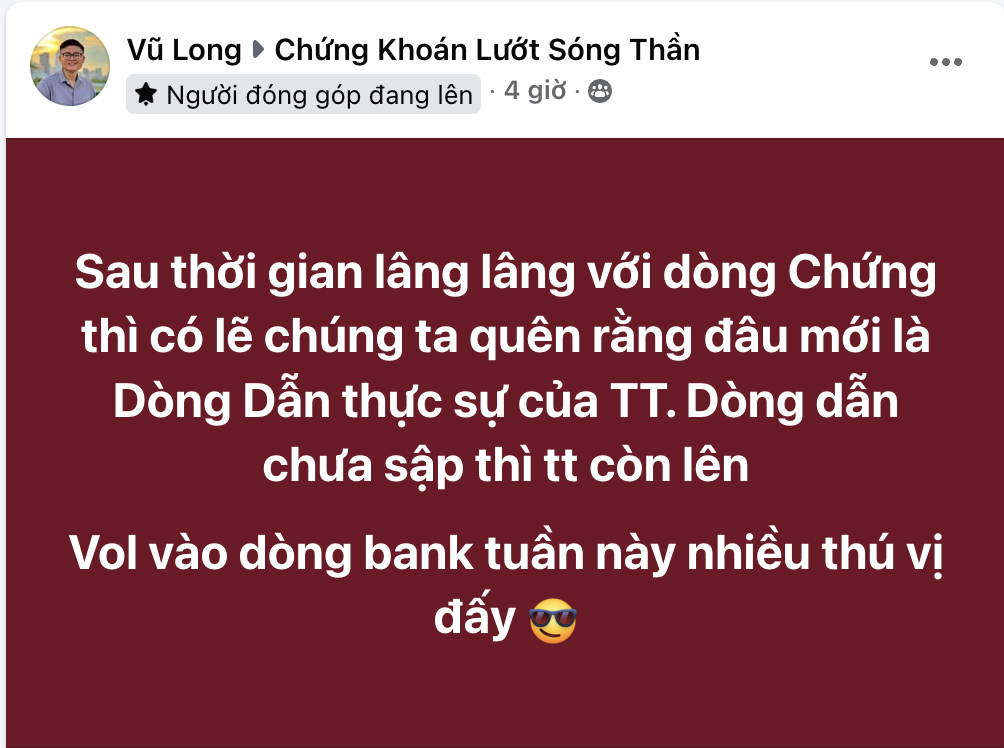 Ko quan trọng việc chúng ta chưa mua hay đã từng rớt hàng hay bán hàng bank những phiên trước. Quan trọng là sang tuần nếu dòng bank bắt đầu bùng nổ, chúng ta sẽ cần có hàng, vì đây chính là dòng dẫn dắt của thị trường, để ăn nhịp chạy cao trào của cổ phiếu, một nhịp đầu cơ dòng tiền cực kỳ trọng yếu của mọi con sóng