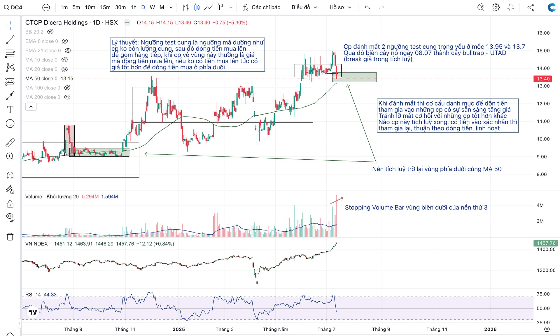 vol này trong bối cảnh giai đoạn này thì có thể chấp nhận được cách đi vol này, về cấu trúc thì có sự thiếu chặt chẽ, nền này giống mấy nền phía trên của dòng BĐS KCN như PHR giai đoạn trước cú sụp đổ thiên nga đen, với đặc tính penny của DC4 thì mình xử lý nhanh, nếu sau tích luỹ chặt chẽ hơn thì mình đánh giá tiếp nên tham gia lại hay ko, cây mồi tiền 08.07 thiếu sự củng cố tiếp, tức cũng ko có cầu mạnh vào cp đoạn này, và vi phạm các ngưỡng test cung thì xử lý dần ra thôi