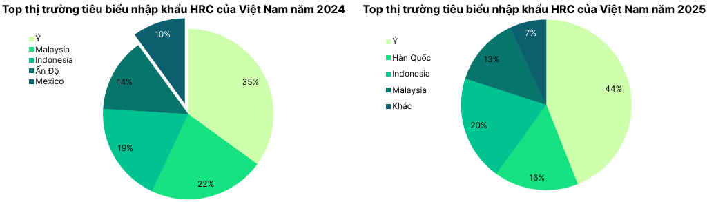 Năm 2025, tổng xuất khẩu HRC của Việt Nam chỉ còn khoảng 863 nghìn tấn, giảm mạnh 75,4% so với mức hơn 3,5 triệu tấn của năm 2024. Đây là sự sụt giảm mang tính bước ngoặt, cho thấy xuất khẩu không còn là kênh tiêu thụ chủ lực như giai đoạn trước.
