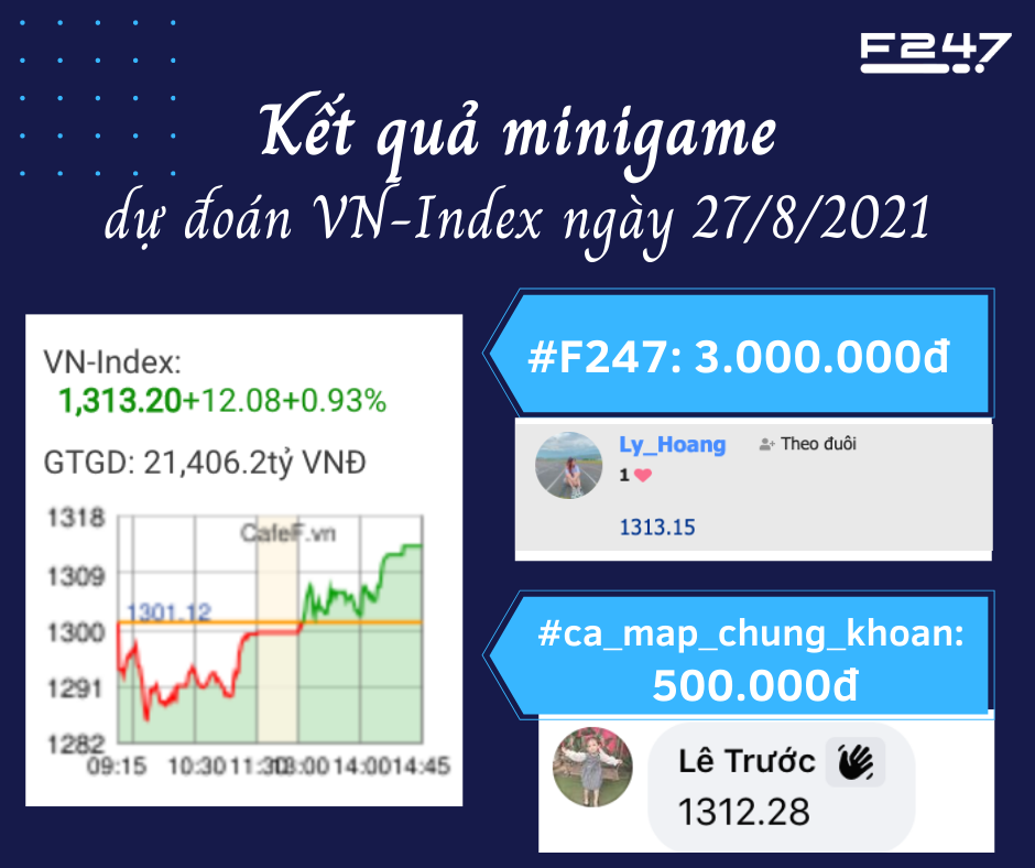 - Giải thưởng 500.000đ khi tham gia trên post minigame trong Group Facebook Cá Mập Chứng khoán thuộc về tài khoản Lê Trước với dự đoán 1312.28