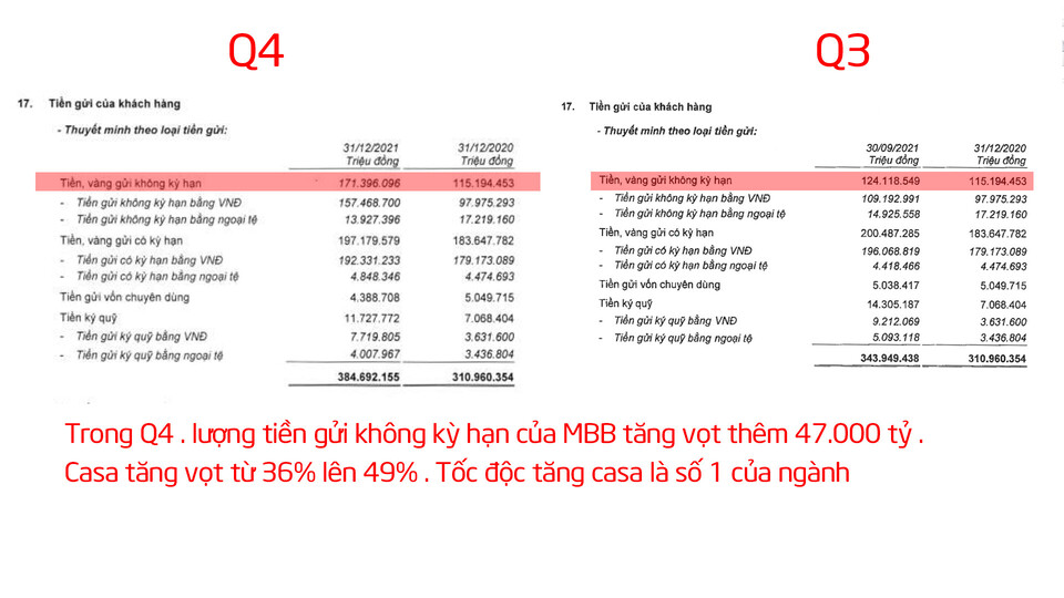 Chính vì vậy MBB hưởng lợi cực lớn từ lượng tiền không kỳ hạn ngày càng tăng lên trong hệ sinh thái của mình .Trong khi vẫn có thể dùng tiền đó cho vay có kỳ hạn với khách hàng , từ đó Nim của MBB sẽ tăng lên liên tục và còn tăng lên mạnh trong 2022 khi MBB tiếp tục chuyển đổi số mạnh mẽ