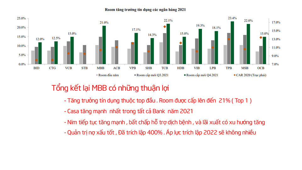 - MBB tăng trưởng tín dụng thuộc top đầu . Room được cấp lên đến 21% ( Top 1 )
