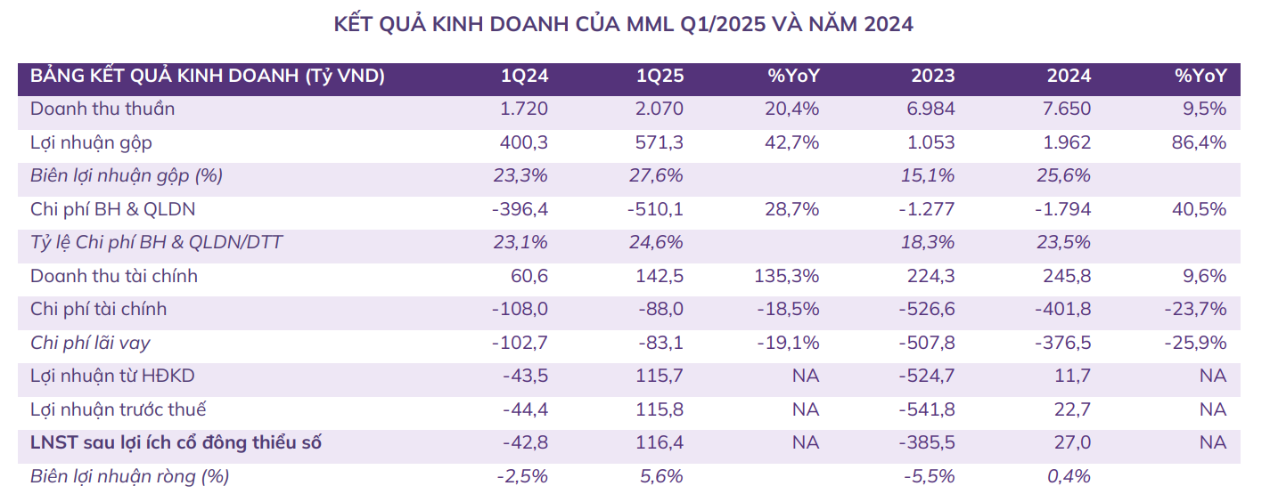 LNST cổ đông công ty mẹ Q1/2025 đạt 116,4 tỷ đồng (cải thiện mạnh so với mức lỗ 42,8 tỷ cùng kỳ năm 2024). Năm 2025, MML đặt kế hoạch doanh thu và LNST theo kịch bản tốt lần lượt 8.750 tỷ đồng và 205 tỷ đồng. Với kết quả đạt được trong Q1/2025, MML đã hoàn thành 23,7% kế hoạch doanh thu và 56,4% kế hoạch LNST.