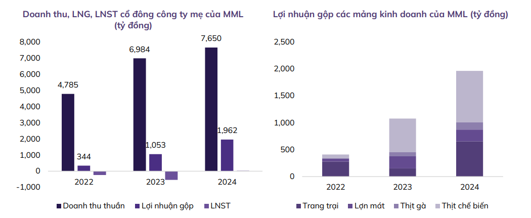 Trong giai đoạn 2022-2024, MML đã thoái toàn bộ mảng TACN và bắt đầu chuyển trọng tâm sang mảng thịt chế biến. Tuy mảng trang trại vẫn là nguồn lợi nhuận chính và phải bù lỗ cho mảng thịt, KQKD mảng thịt và thịt chế biến đã bắt đầu cho thấy những dấu hiệu tích cực.