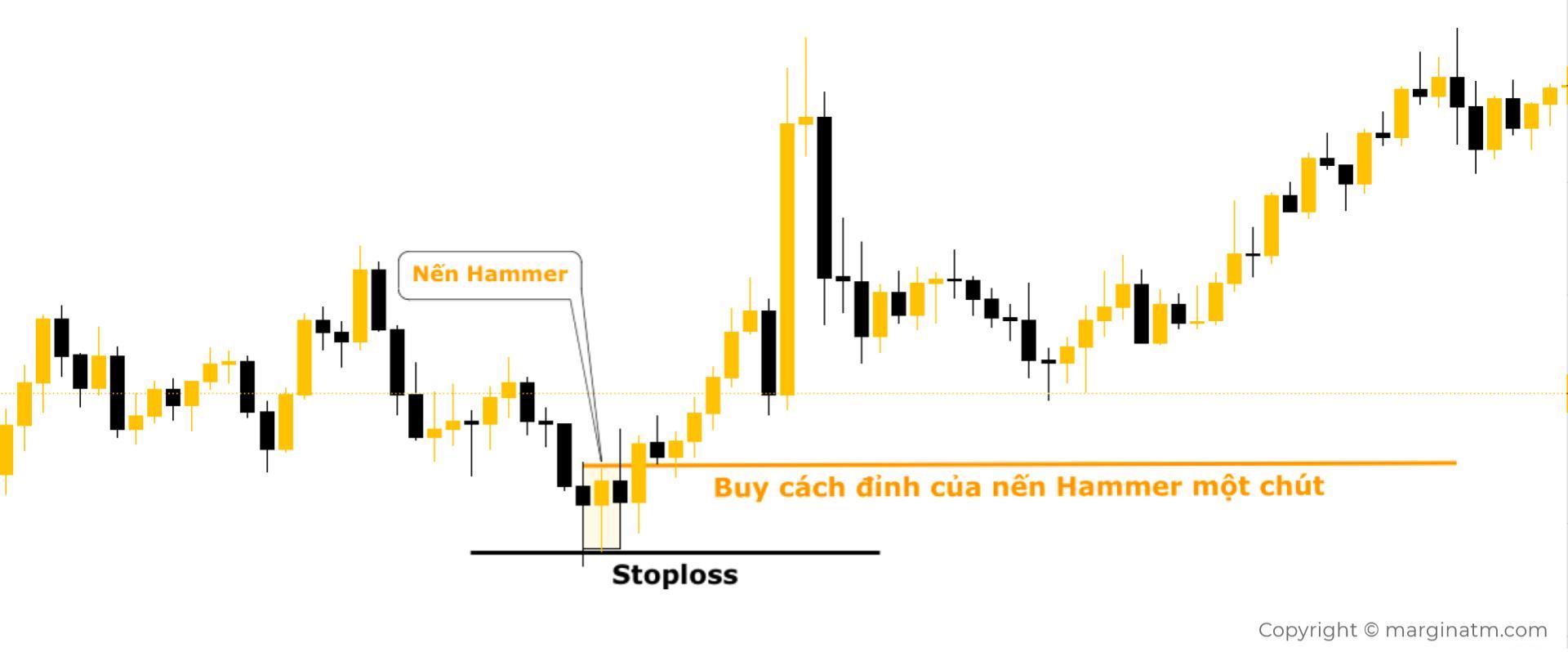 - Bạn hãy đặt lệnh Buy ngay khi Hammer đóng nến, và đặt stoploss thấp hơn bóng nến Hammer một chút để phòng trường hợp bị quét.