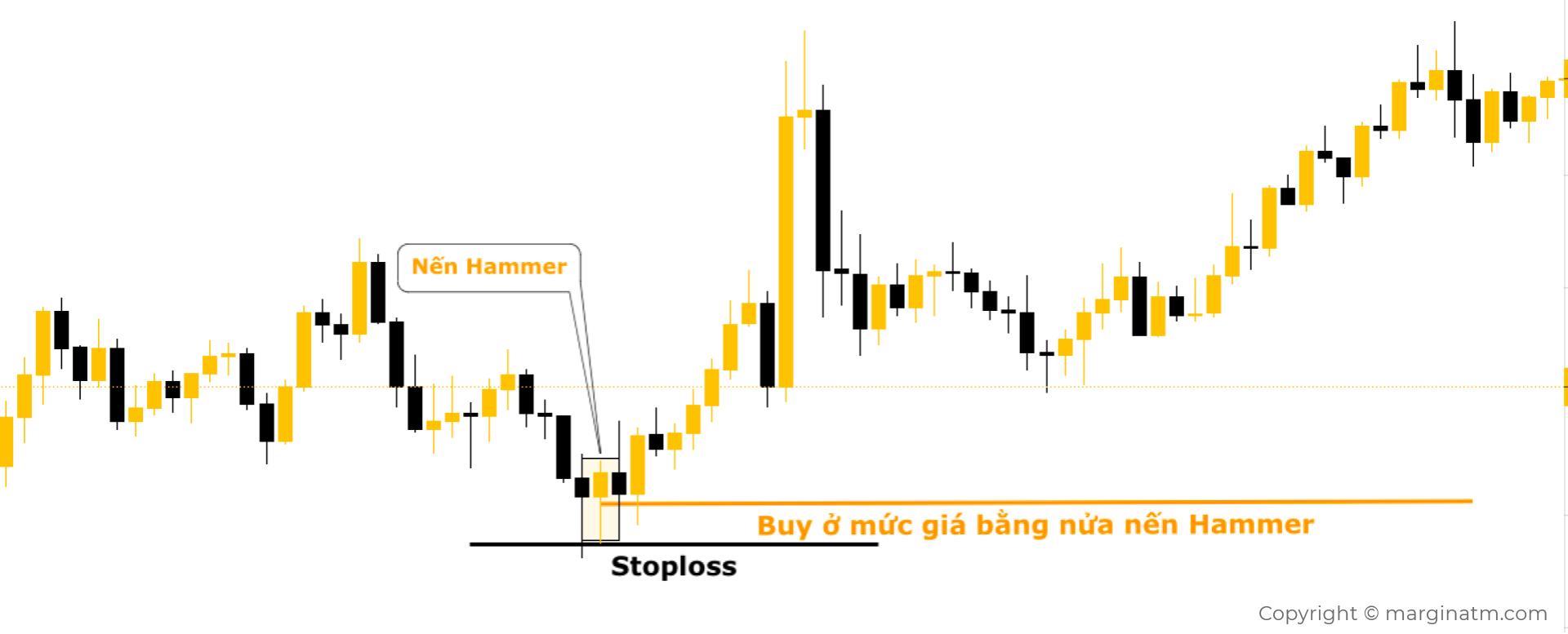 - Bạn hãy đặt lệnh Buy (Buy Limit) ở mức giá bằng nửa nến Hammer. Và đặt stoploss thấp hơn bóng nến Hammer một chút để phòng trường hợp bị quét. Cách này sẽ giúp bạn có lợi nhuận cao nhất nhưng đôi khi sẽ có trường hợp không khớp lệnh vì giá tăng luôn mà không hồi lại