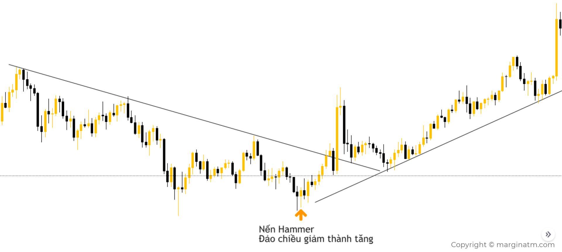 - Ở một xu hướng giảm xuất hiện nến Hammer => Đảo chiều từ giảm thành tăng.