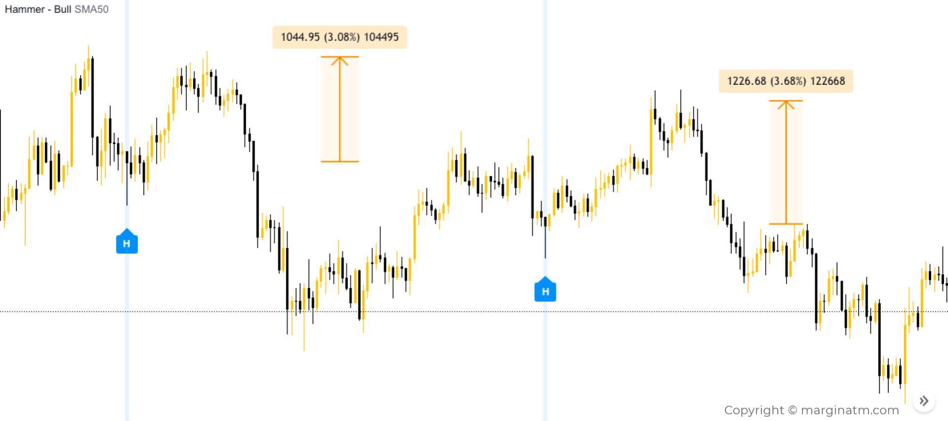 Nến Hammer thường được hình thành ở cuối xu hướng giảm giá. Sự xuất hiện của loại nến này thể hiện một nỗ lực tạo đáy mới.