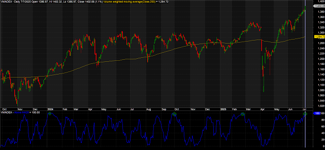 Thị trường chứng khoán Việt Nam đang trải qua giai đoạn hồi phục mạnh mẽ, với chỉ số VN-Index vượt ngưỡng tâm lý 1,400 điểm. Một điểm đáng chú ý là sau phiên giao dịch ngày 07/07, toàn bộ 100% cổ phiếu thuộc nhóm ngân hàng đều đã vượt lên trên đường trung bình động MA20 – tín hiệu cho thấy xu hướng tăng ngắn hạn đã được thiết lập trên diện rộng. Đây là hiện tượng chỉ xuất hiện vài lần trong một năm.