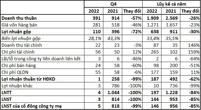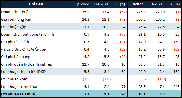 Một điểm sáng khác là chi phí lãi vay giảm hơn nửa so với năm 2021, kéo theo chi phí tài chính giảm ở mức tương tự, còn 17 tỷ đồng.