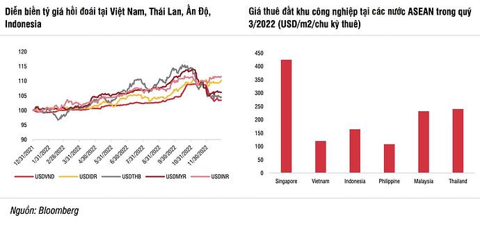 Mặt khác, đầu tư vào các KCN Việt Nam vẫn được đánh giá là hấp dẫn do mệnh giá VND mất giá ít hơn so với đồng tiền của các nước trong khu vực như Indonesia, Thái Lan, Ấn Độ và Malaysia và các thị trường trọng điểm khác của Châu Á Thái Bình Dương như Nhật Bản. Hai là các chính sách thu hút FDI của Việt Nam cũng giúp thu hút các nhà đầu tư bằng cách đưa ra nhiều ưu đãi; Giá cho thuê đất khu công nghiệp tại Việt Nam vẫn ở mức thấp so với các nước ASEAN, cụ thể thấp hơn 30~36% so với Indonesia và Thái Lan.