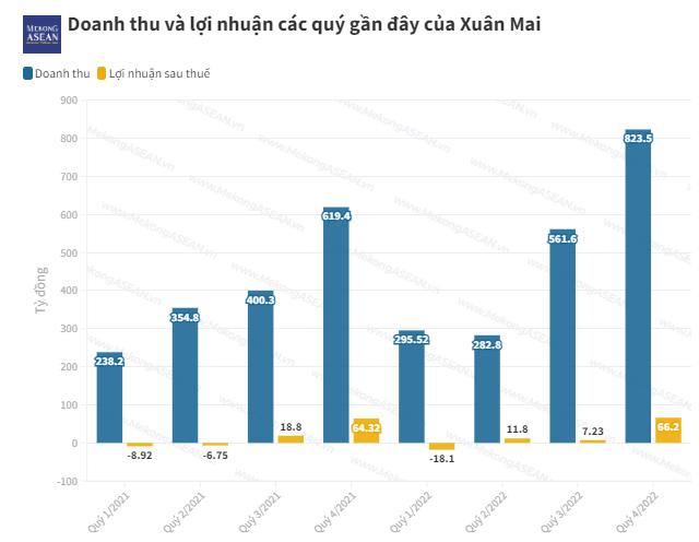 Khấu trừ các chi phí, Xuân Mai Corp báo lãi quý 4 tăng gần 3% so với cùng kỳ 2021 lên 66,16 tỷ đồng. Kết quả kinh doanh này vượt trội so với 3 quý còn lại của năm 2022. Cụ thể, quý 1 Xuân Mai báo lỗ 18 tỷ đồng, quý 2 lãi hơn 11,8 tỷ đồng và quý 3 lãi gần 7,23 tỷ đồng.