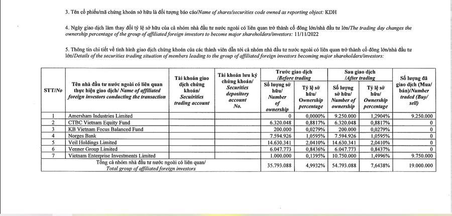 THeo đó, VOF Investment Limited, quỹ thành viên thuộc VinaCapital thông báo đã bán ra 4.110.000 cổ phiếu KDH trên tổng số 10 triệu cổ phiếu đã đăng ký. Từ ngày 12/12 đến ngày 10/01/2023. Tuy nhiên kết thúc thời gian trên quỹ này không bán được hết là do diễn biến thị trường chưa phù hợp. Giao dịch được thực hiện theo phương thức thỏa thuận và khớp lệnh.