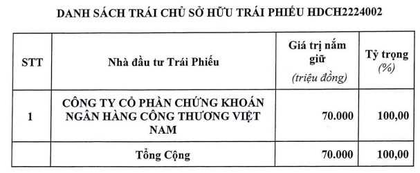 Theo văn bản công bố, có 1 nhà đầu tư tổ chức trong nước đã mua lại trọn lô trái phiếu này là Chứng khoán Ngân hàng Công thương Việt Nam (CTS).
